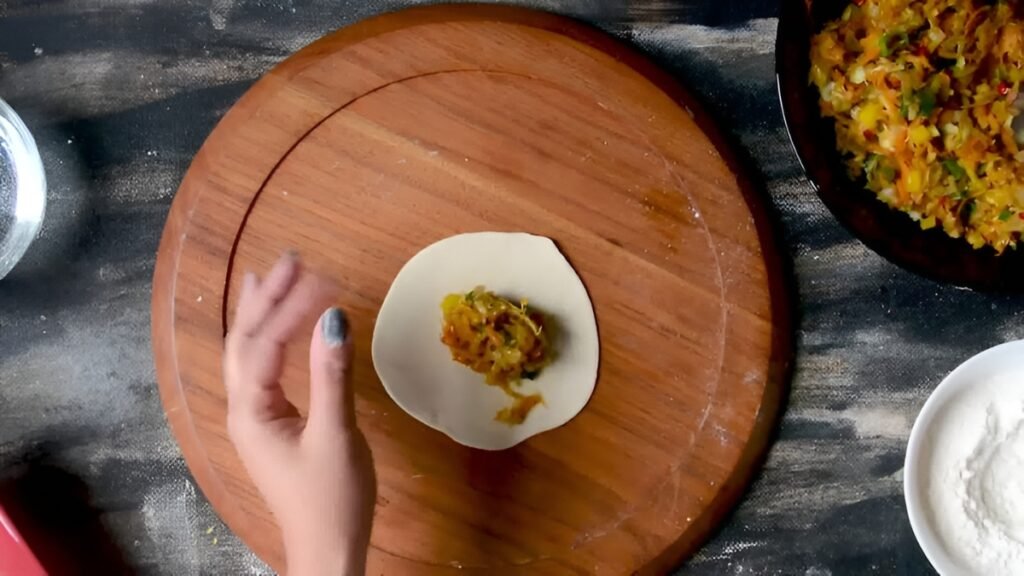 Divide the dough into small balls and roll each into a thin circle (about 3 inches wide). Place a spoonful of filling in the center, then fold and pinch the edges to seal. You can shape them into half-moons or pleated rounds whatever feels fun.