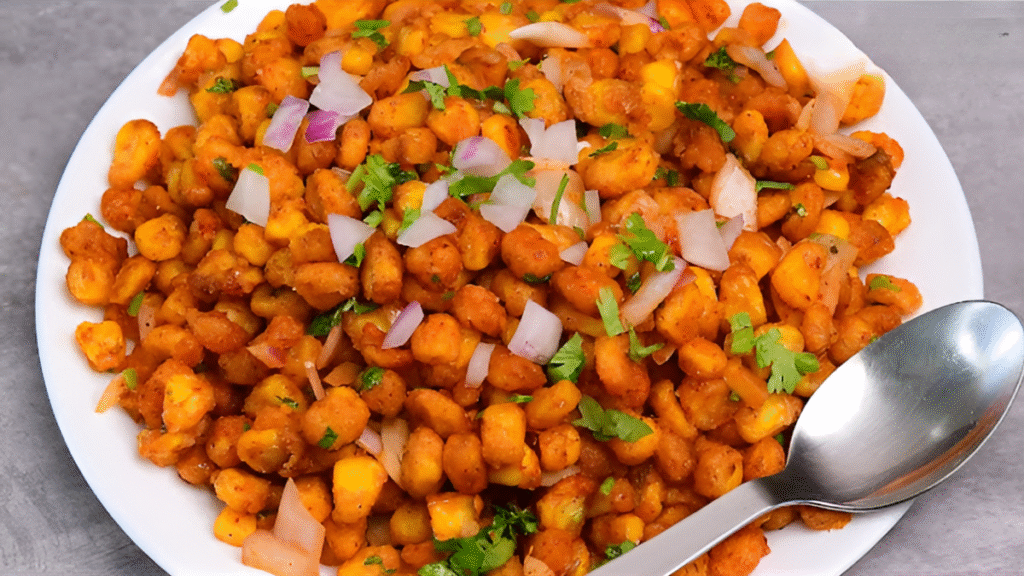 - Sweet corn kernels are sautéed with butter, salt, and chaat masala.