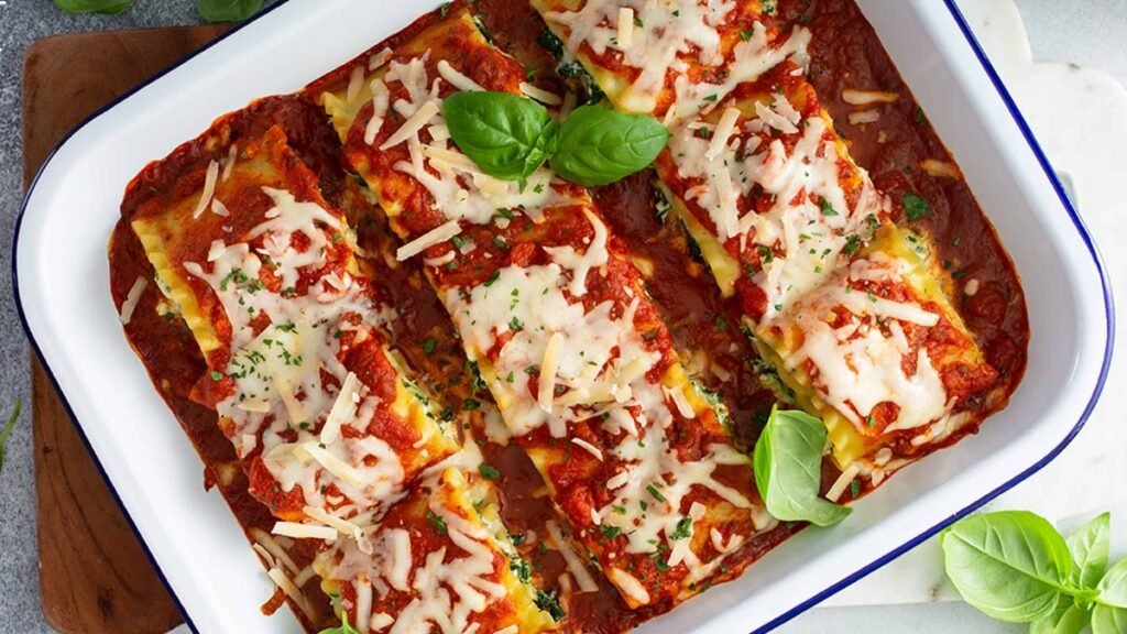 | 5 | Assemble Rolls | Spread filling on each lasagna sheet and roll tightly. Place rolls seam-side down in a baking dish. |